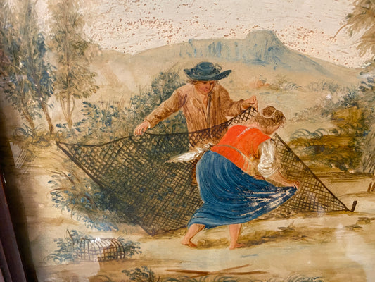 18th / 19th Century Chinese Export Reverse Painting on Glass European Bird Catchers Scene