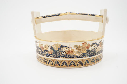 Japanese Edo Period Imperial Satsuma Gosu Blue Signed Basket 9 Inch Width #1