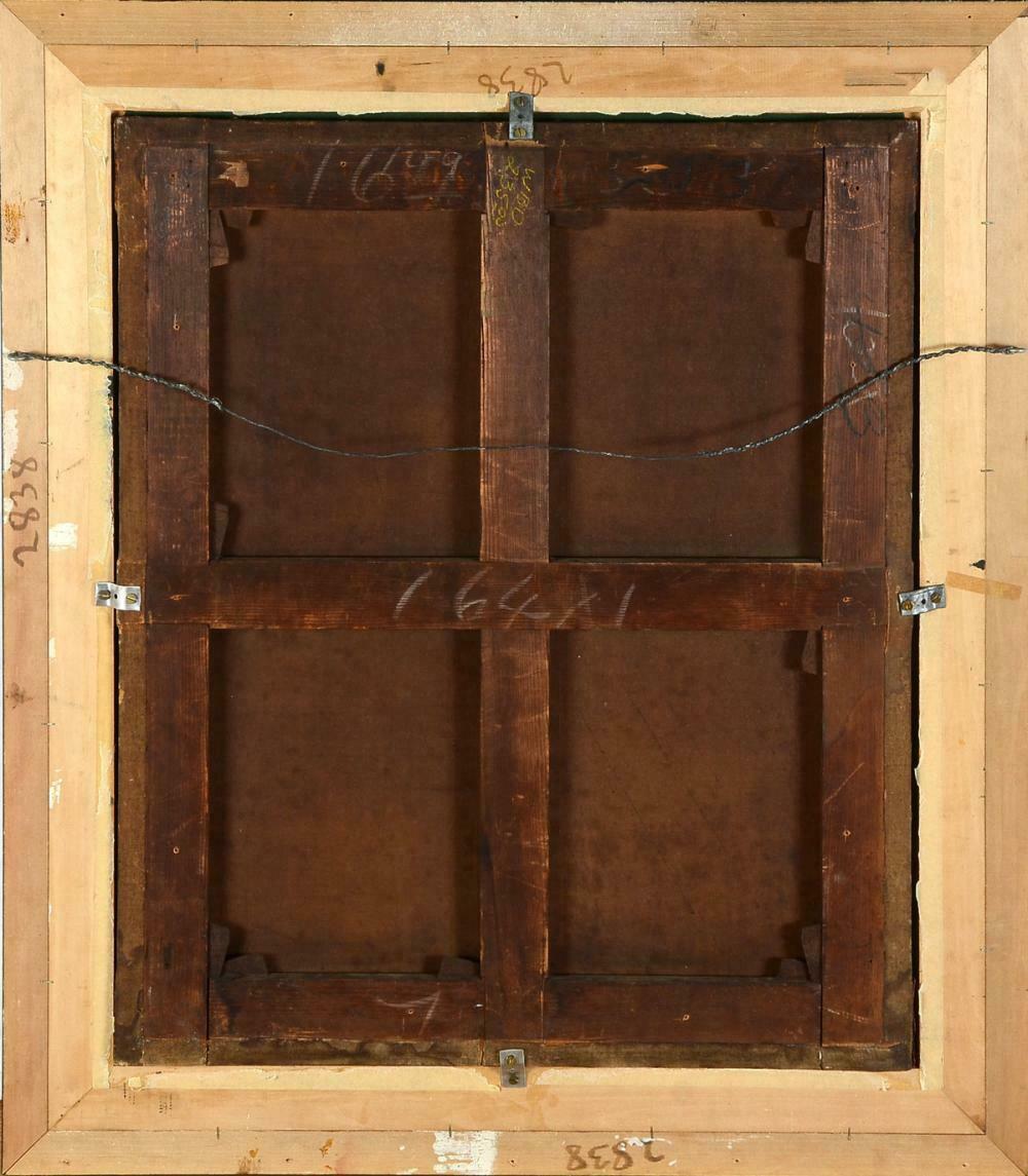Size of painting work 37.5 inches by 32.5 inches. Measures 40" x 25", encased in a gilded and ebonized frame.