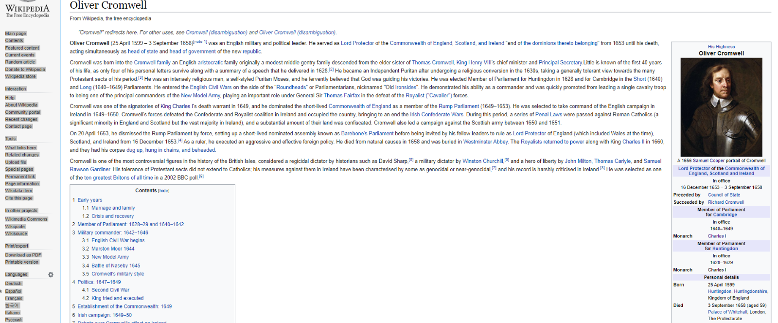 Oliver Cromwell (born 25 April 1599 – died 3 September 1658) is considered one of the most important historical figures in UK history.