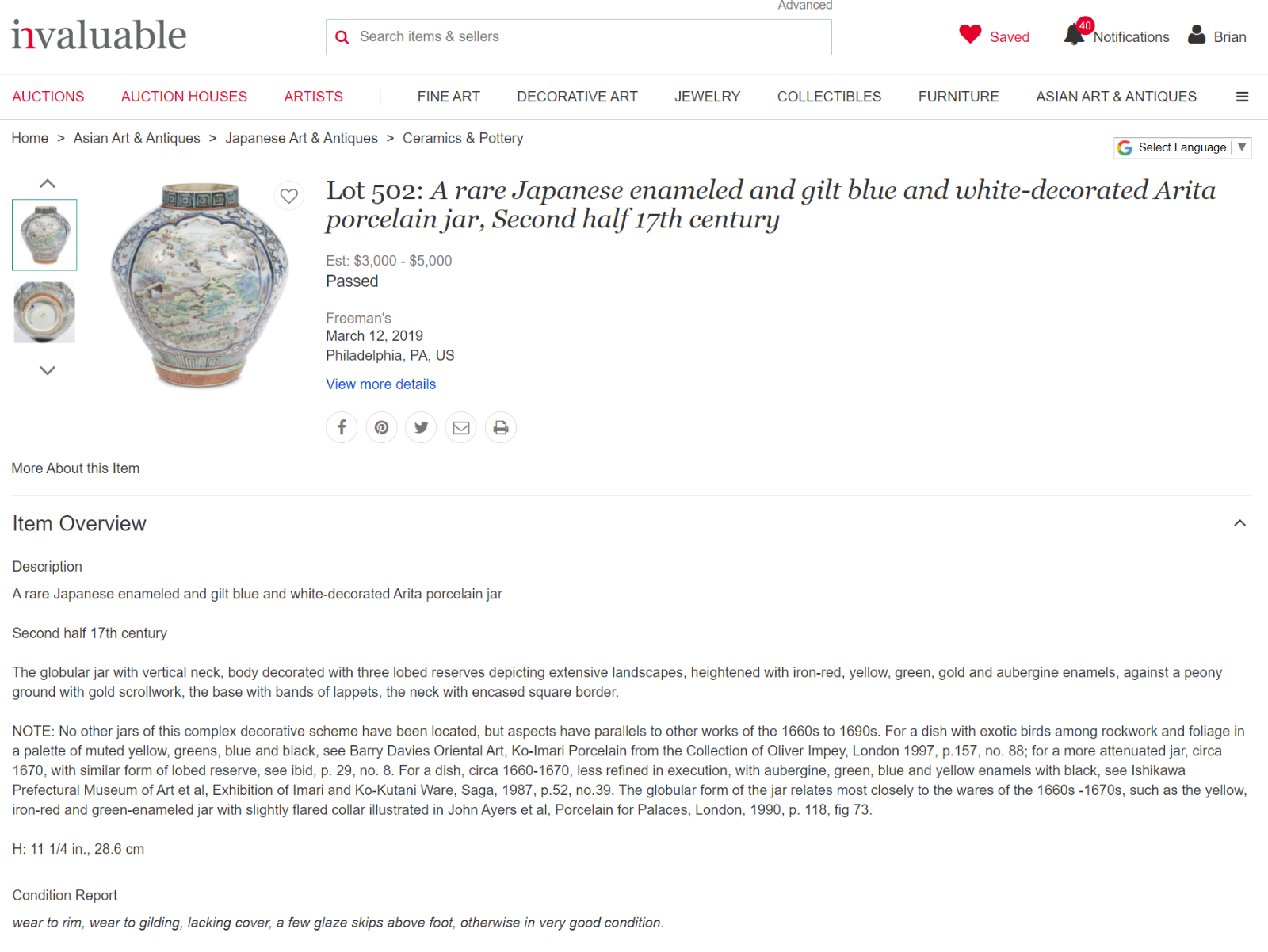 Auction notes of piece: "NOTE: No other jars of this complex decorative scheme have been located, but aspects have parallels to other works of the 1660s to 1690s. For a dish with exotic birds among rockwork and foliage in a palette of muted yellow, greens, blue and black, see Barry Davies Oriental Art, Ko-Imari Porcelain from the Collection of Oliver Impey, London 1997, p.157, no. 88; for a more attenuated jar, circa 1670, with similar form of lobed reserve, see ibid, p. 29, no. 8. For a dish, circa 1660-1670, less refined in execution, with aubergine, green, blue and yellow enamels with black, see Ishikawa Prefectural Museum of Art et al, Exhibition of Imari and Ko-Kutani Ware, Saga, 1987, p.52, no.39. The globular form of the jar relates most closely to the wares of the 1660s -1670s, such as the yellow, iron-red and green-enameled jar with slightly flared collar illustrated in John Ayers et al, Porcelain for Palaces, London, 1990, p. 118, fig 73."