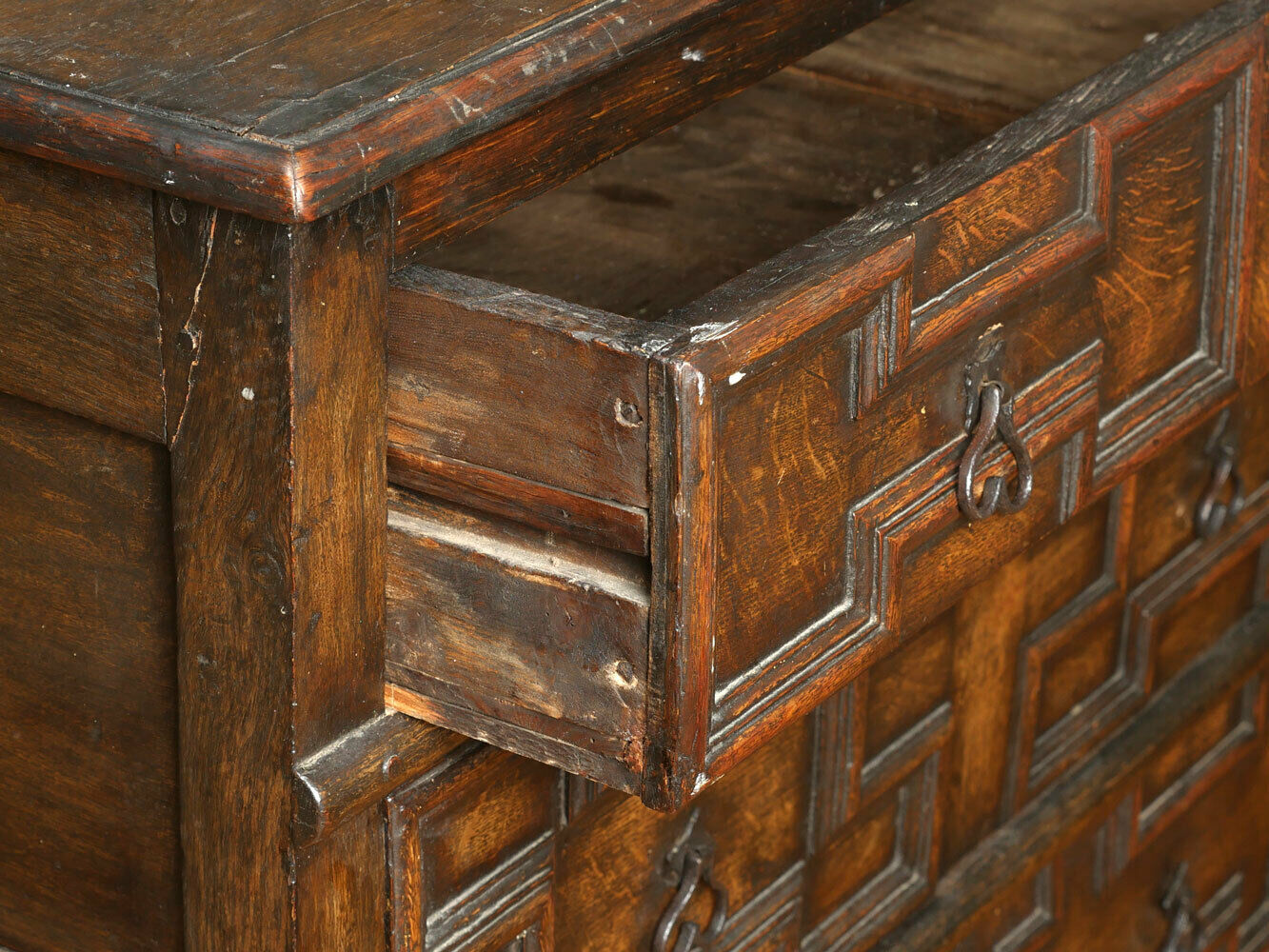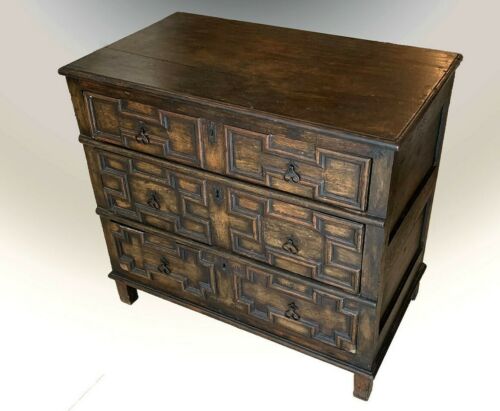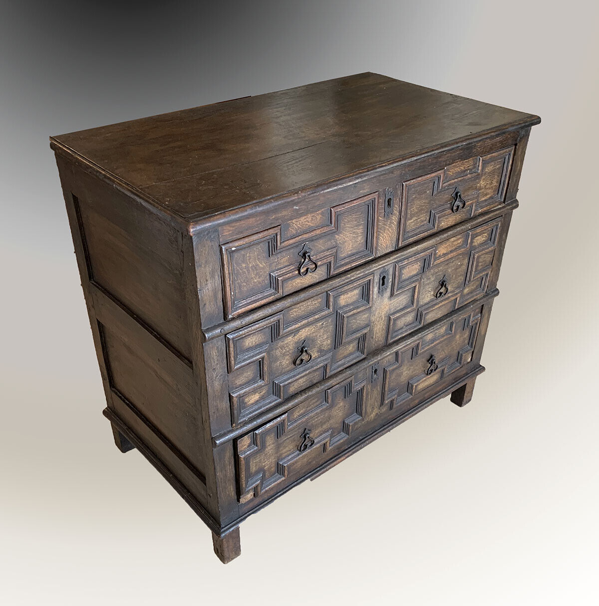 William & Mary 3 drawer chest having raised geometrical designs, heart shaped drop handles