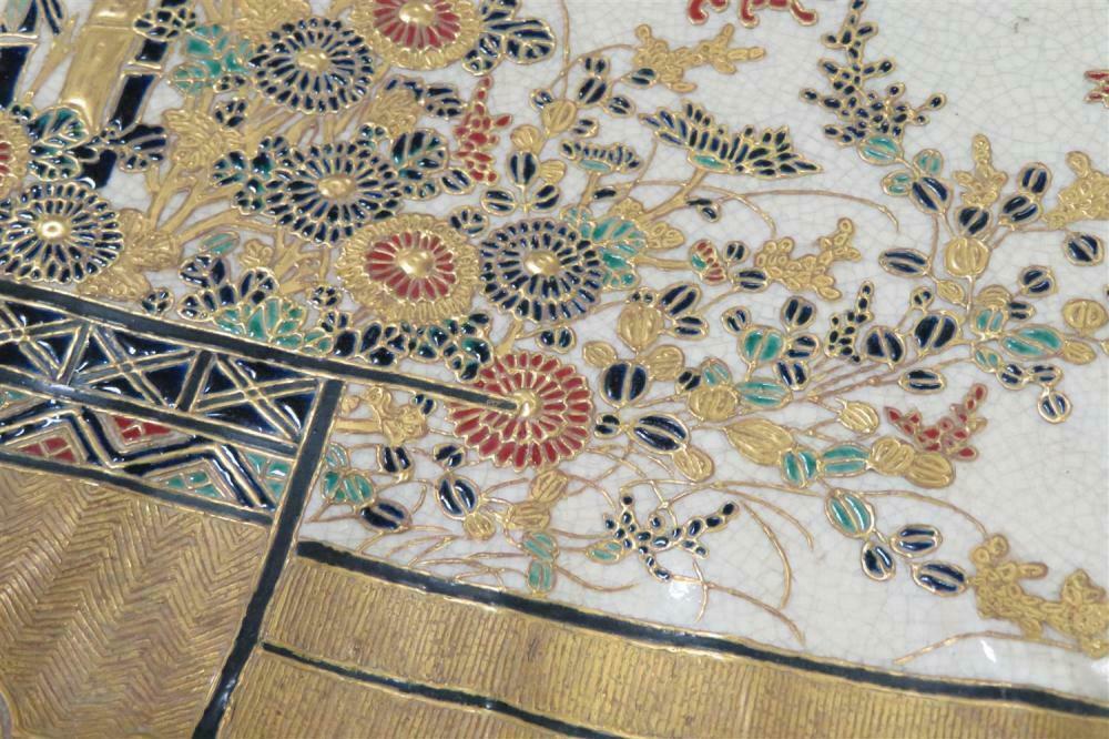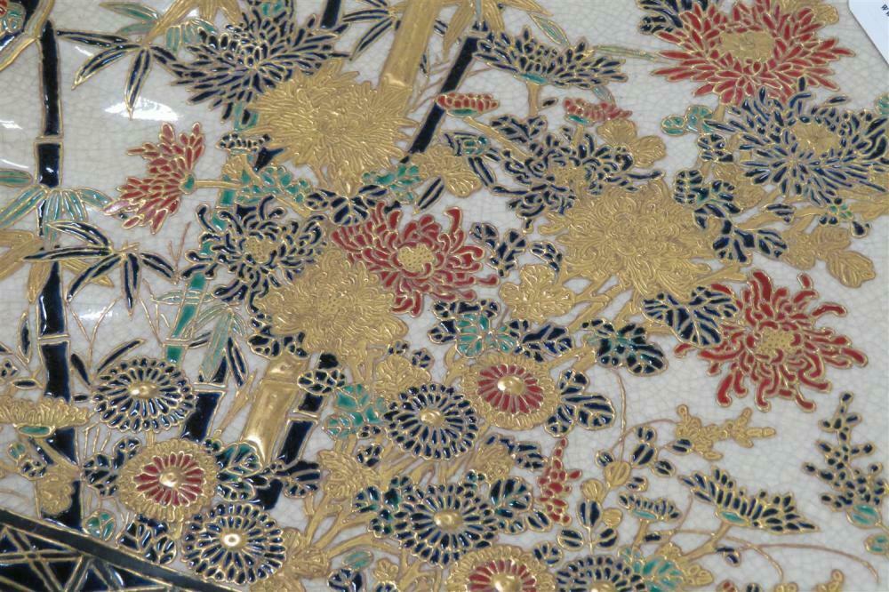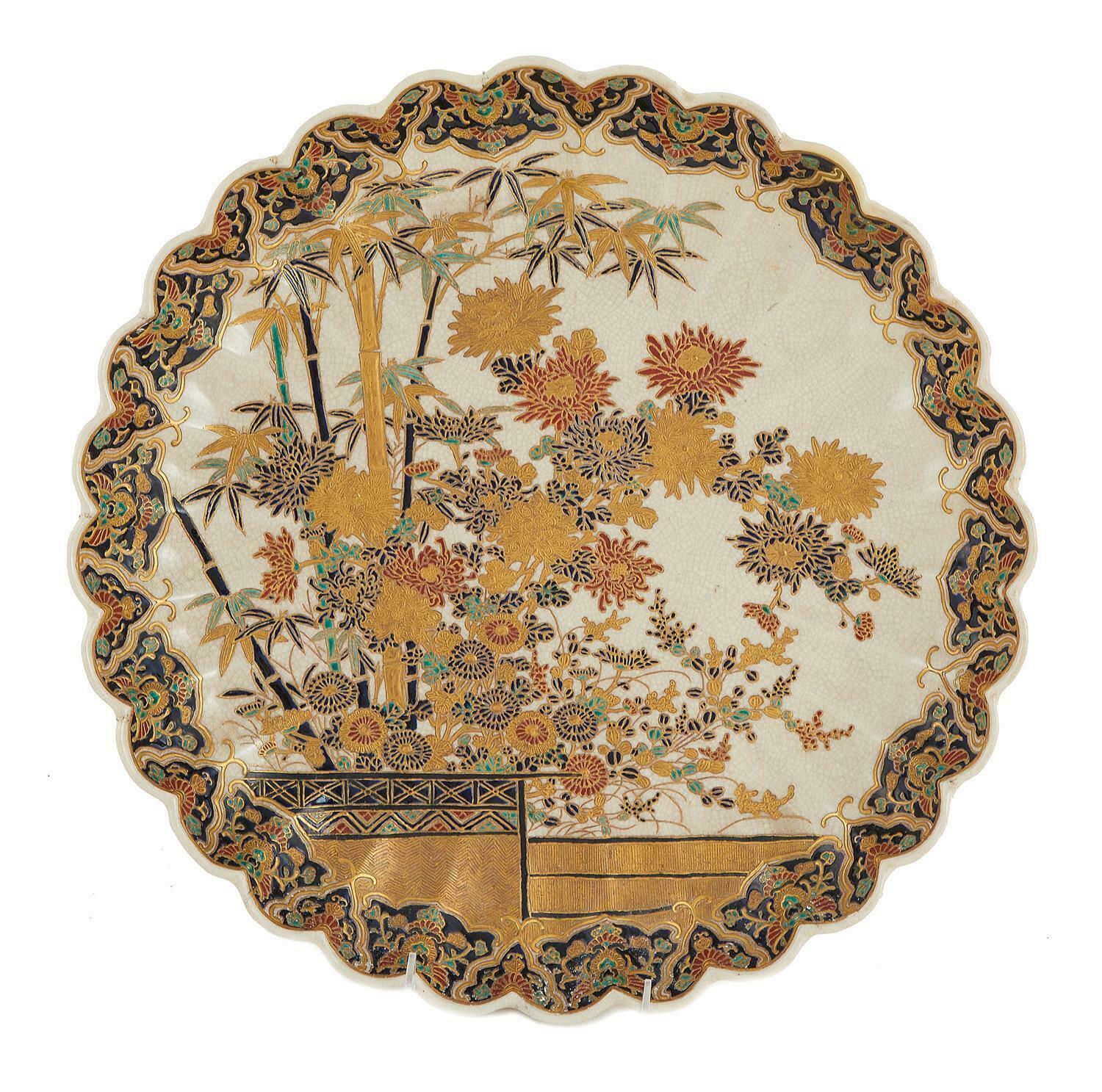 Japanese Satsuma charger, signed Edo period, scalloped rim chrysanthemum form charger decorated with side border centering flower and bamboo arrangement.