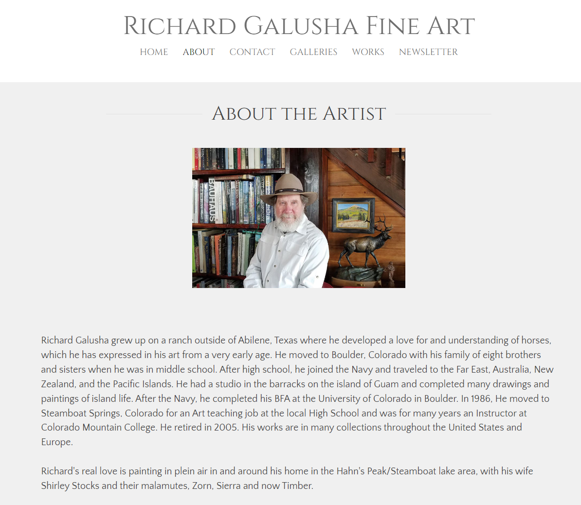 Richard Galusha grew up on a ranch outside of Abilene, Texas where he developed a love for and understanding of horses, which he has expressed in his art from a very early age. He moved to Boulder, Colorado with his family of eight brothers and sisters when he was in middle school. After high school, he joined the Navy and traveled to the Far East, Australia, New Zealand, and the Pacific Islands. He had a studio in the barracks on the island of Guam and completed many drawings and paintings of island life. After the Navy, he completed his BFA at the University of Colorado in Boulder.