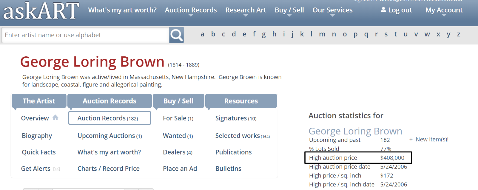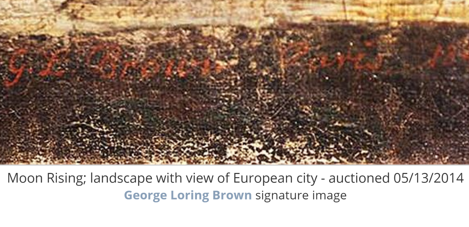 Signature: The 1st signature image is of work. The 2nd (similar) signature is the known signature of George Loring Brown ( G. L. Brown) Source: Askart.com .